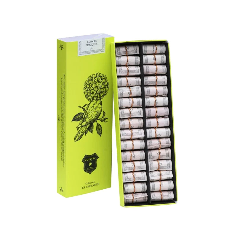 • 30 billets doux roulés à la main et parfumés à l'ambre et imprimés de paroles magiques.