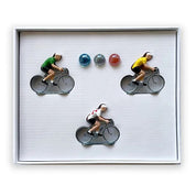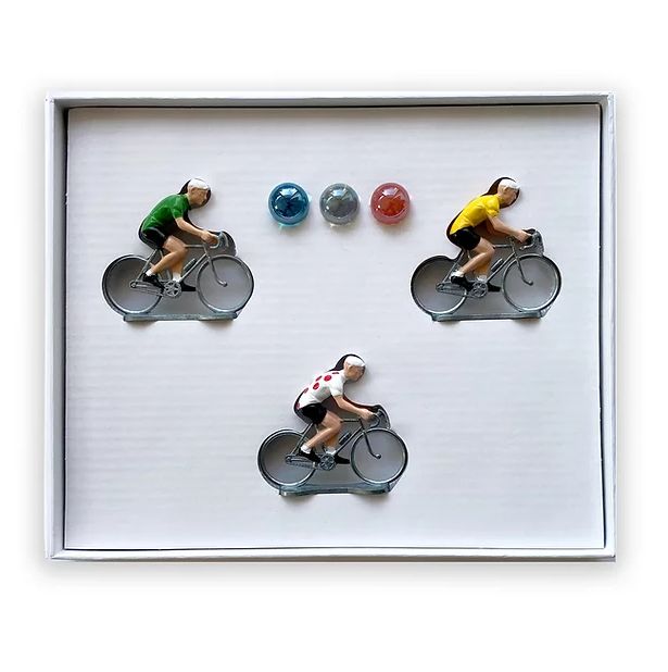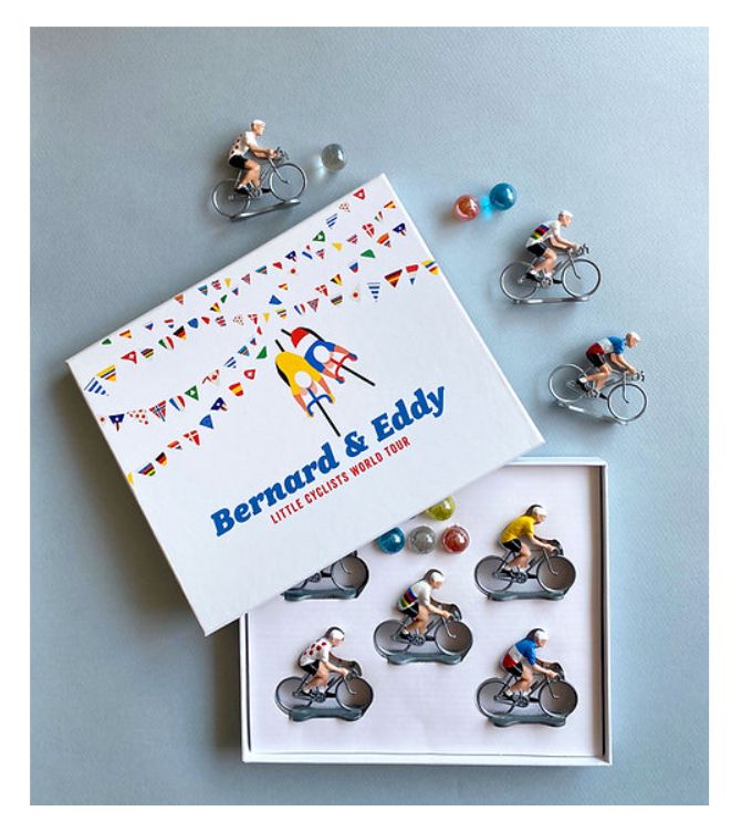 Bernard & Eddy is a toy, a game, a joyful peloton of little cyclists. Each figurine, a unique hand-painted metal piece, represents a country, or an emblematic jersey of the Tour de France. Fetish objects, lucky charms when you're not playing with them, they are there, and wander around with charm on a shelf, a chest of drawers or a desk. This box brings together the 3 most emblematic jerseys from the biggest cycling race in the world.