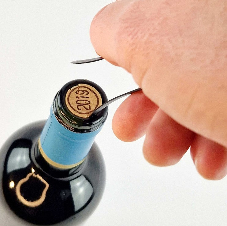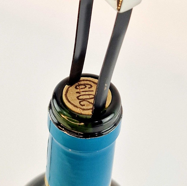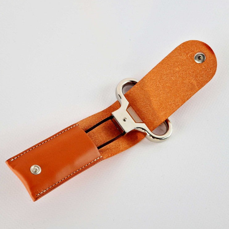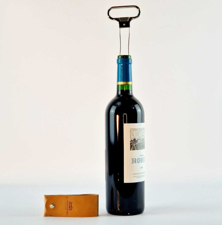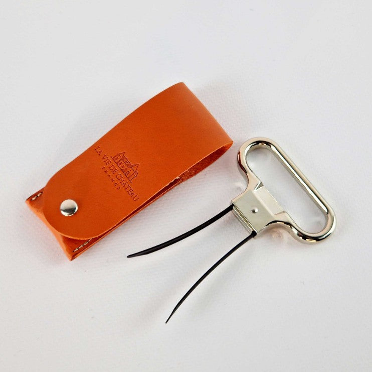 The “crowbar” crate opener in its case, vegetable-tanned leather grip, ideal for opening wooden crates of wine or Champagne.