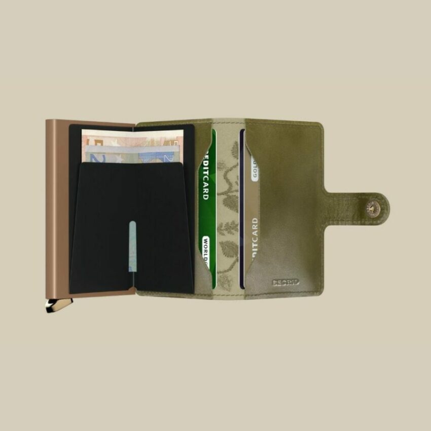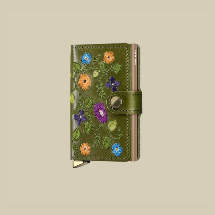The Secrid Miniwallet stitch-floral-olive is handcrafted as well as its embroidery in exceptional leather.
