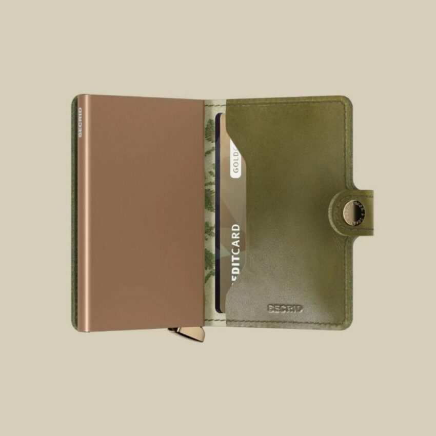 The SECRID Miniwallet are modern wallets and compact card holders in which you can slide up to 5 credit cards into its secure case (aluminum card-protector) and 4 others into the second compartments. You can add business cards, ID (new format) or your driving license. Light, strong, practical, it now replaces bulky wallets! The Secrid Premium stitch-floral-olive line features a metal mechanism ensuring greater durability, high-quality Italian leather and an even more refined design. It’s the brand’s ultimate.