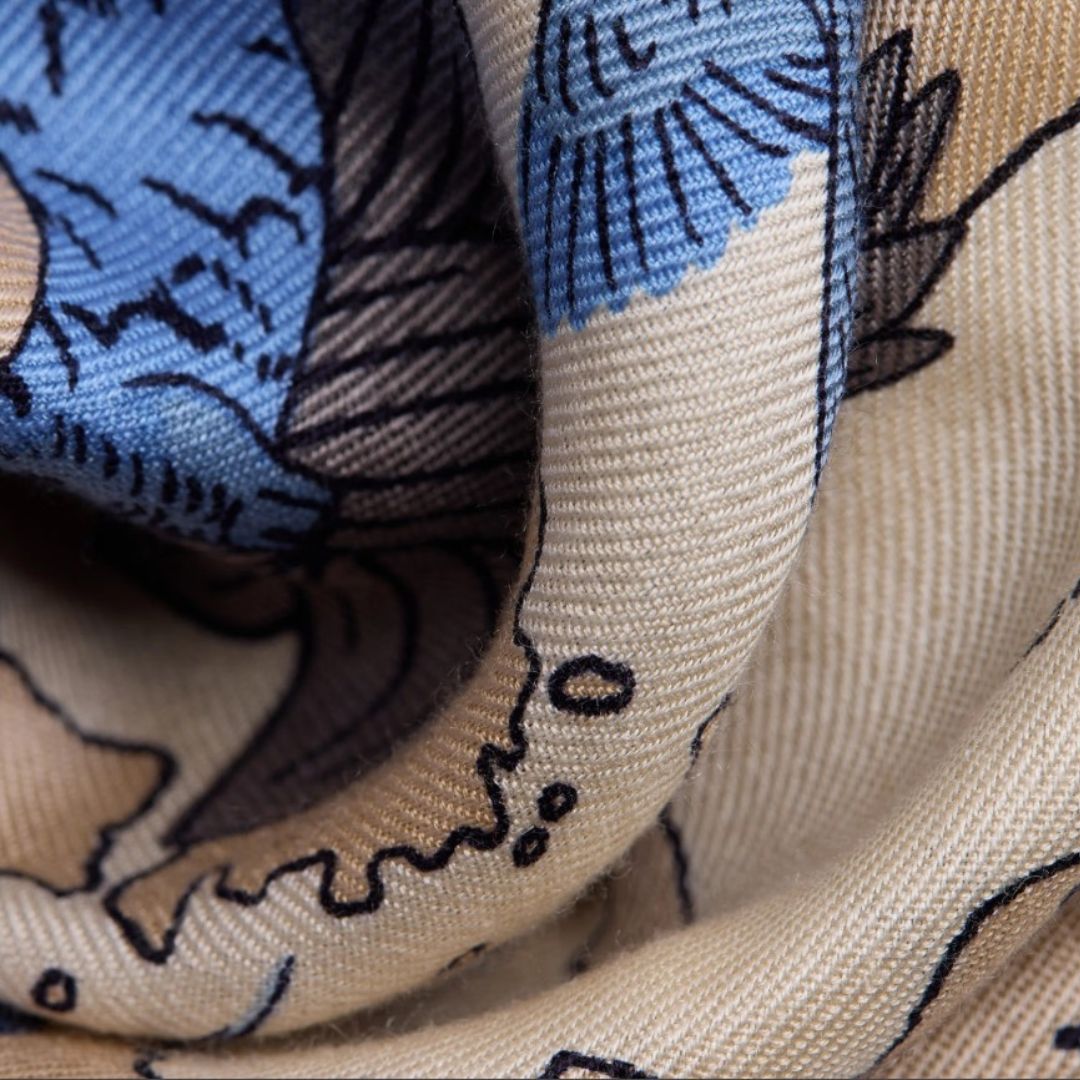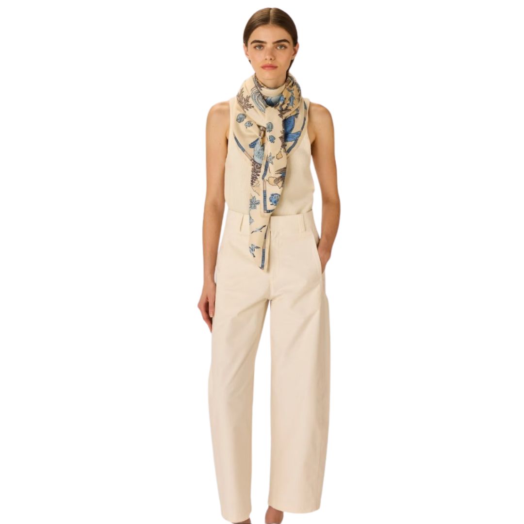 Le Carré 130 - Atlas Blanc est un hymne à la diversité de la nature. Sont répartis sur une mappemonde des centaines de dessins d'animaux. On retrouve tout le style de la maison française dans une composition audacieuse, portée par un dessin riche et précis. On aime la combinaison de blanc, de beige clair et de bleu qui dynamise une tenue estivale. Ce modèle est également décliné en orange et en beige;