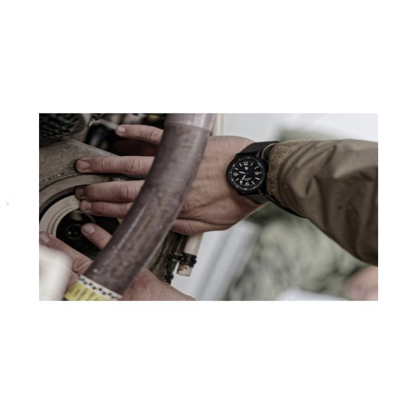 couleur titane mat, index, chiffres arabes et aiguilles couleur titane avec insert super luminova blanc, lunette intérieure bidirectionnelle, date à 3H, sigle des troupes d'élite à 9H Verre