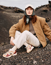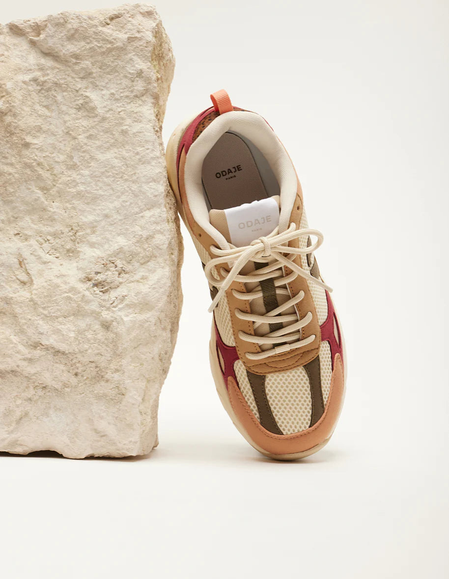 Sa basket running Maé pour femme, dessinée par Charlotte dans leur QG parisien, est éco-designée pour minimiser son impact carbone. Maé se distingue par un harmonieux mélange de couleurs pêche, kaki et beige, et est fabriquée à partir de suède vegan, mesh et cuirs sourcés de manière responsable. Sa semelle extérieure en EVA, complétée par un patin en gomme recyclée, renforce son caractère écoresponsable. Doublée en mesh recyclé, elle offre confort et souplesse grâce à la technique de montage Strobel, une méthode de cordonnerie traditionnelle. Complètement vegan, ses lacets en polyester recyclé en font un choix résolument écoresponsable.